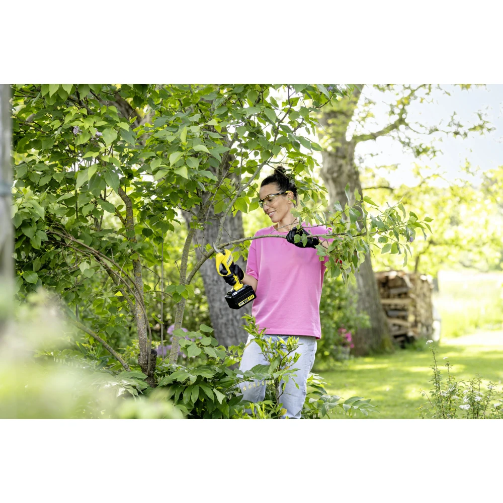 Акумуляторний секатор Kärcher легко справляється з сучками діаметром до 2,5 см. Цей інструмент значно спрощує догляд за деревами і чагарниками завдяки потужному обвідному ножу, який дає змогу акуратно і без зусиль вирізати гілки. Така обережна обрізка сприяє здоровому росту рослин. Додаткову зручність під час роботи над головою забезпечує опціональний телескопічний подовжувач, що дає змогу обрізати гілки на висоті до 3,5 м.