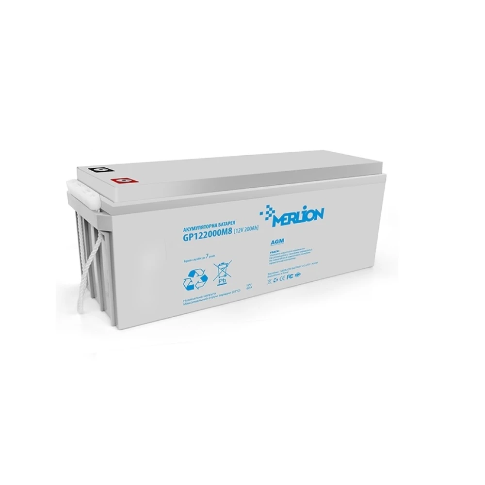 Акумулятор MERLION GP122000M8 - зовнішня батарея призначена для резервного живлення електрообладнання з великим споживанням енергії. Внутрішня ємність досягає 200 А*год при напрузі 12В, чого буде достатньо для довгої роботи приладів, у разі відключення електромережі.