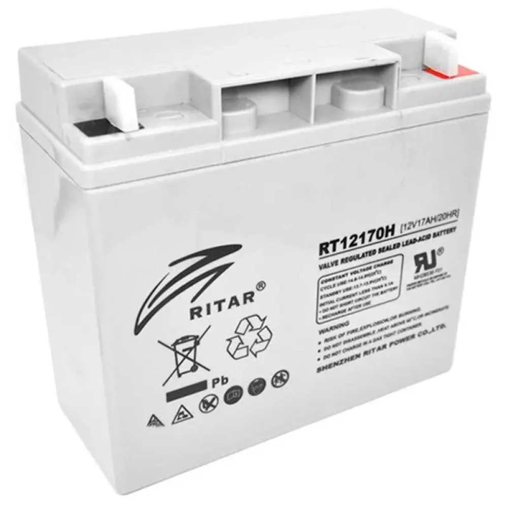 Акумулятор RITAR RT12170H - зовнішня батарея, призначена для резервного живлення електроустаткування. Внутрішня ємність досягає 17 А*год при напрузі 12 В, чого буде достатньо для короткочасної роботи приладів, у разі відключення електромережі.