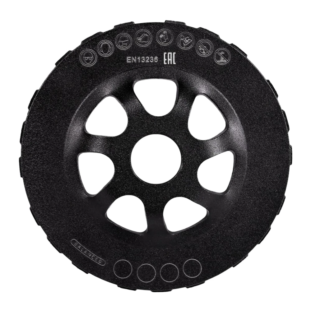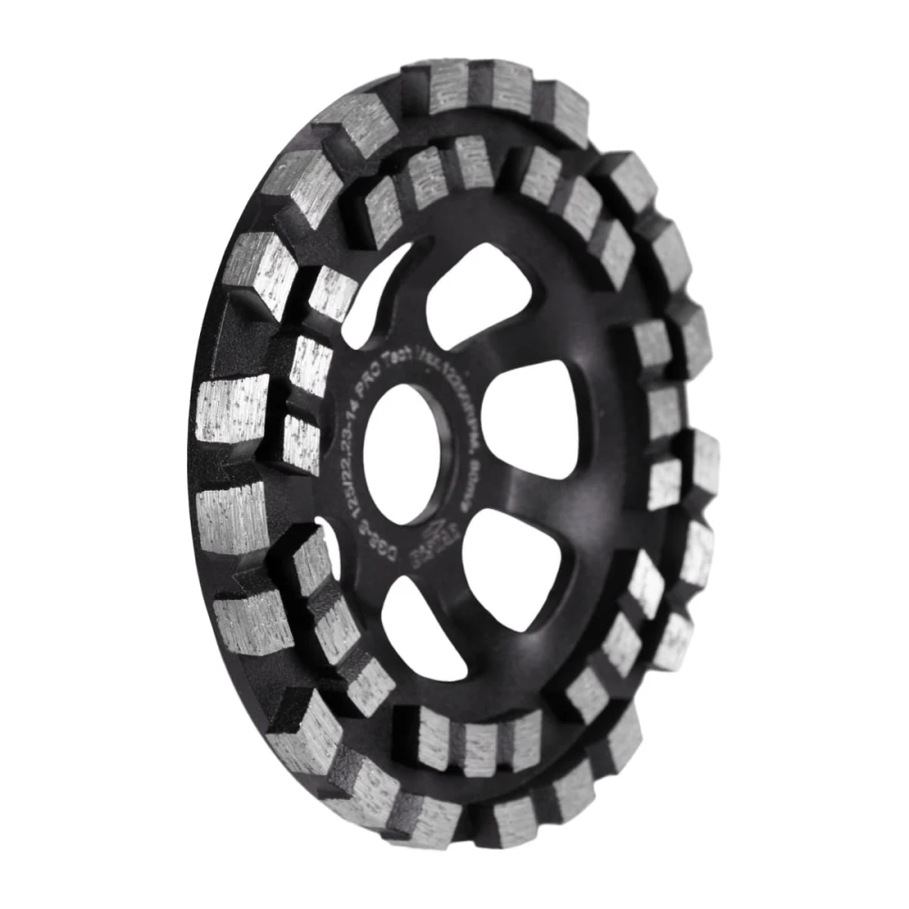 DI-STAR DGS-S 125x22.23 PRO Tech - алмазна фреза для обробки бетонних поверхонь з натурального каменю. Два ряди турбованих сегментів дають змогу досягти високої продуктивності шліфування, що забезпечує швидке виконання робіт навіть на матеріалах високої міцності. Технологія балансування готового виробу сприяє комфортній роботі без будь-яких вібрацій, і зберігає електроінструмент у належному технічному стані. Полегшений корпус із краплеподібними отворами дає змогу шліфувати стіни та стелю без будь-яких труднощів. Інноваційний алмазоносний шар розроблений обробляти такі матеріали як: бетон, цегла, піщаник, граніт, плитковий клей, самовирівнювальна підлога, цементна стяжка, бетонні панелі для інтер'єру та екстер'єру. Зовнішній діаметр становить 125 мм, вага всього 440 грам. Використовується на ручних кутових шліфувальних машинах без охолодження.