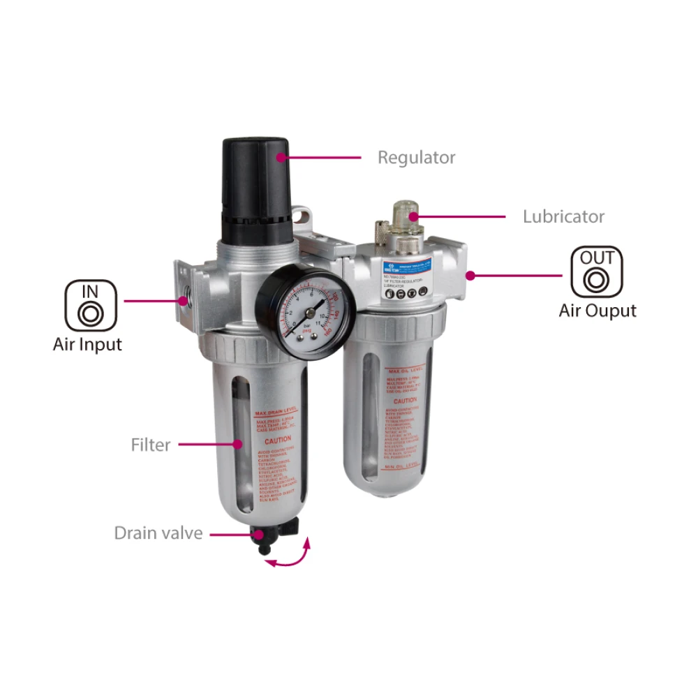 Модульна група підготовки повітря King Tony 799A0-23C - обладнання для фільтрації та очищення повітря від пилу, зайвої вологи і домішок, з подальшою його подачею від компресора до пневмоінструменту. Складається з лубрикатора, фільтра і манометра.