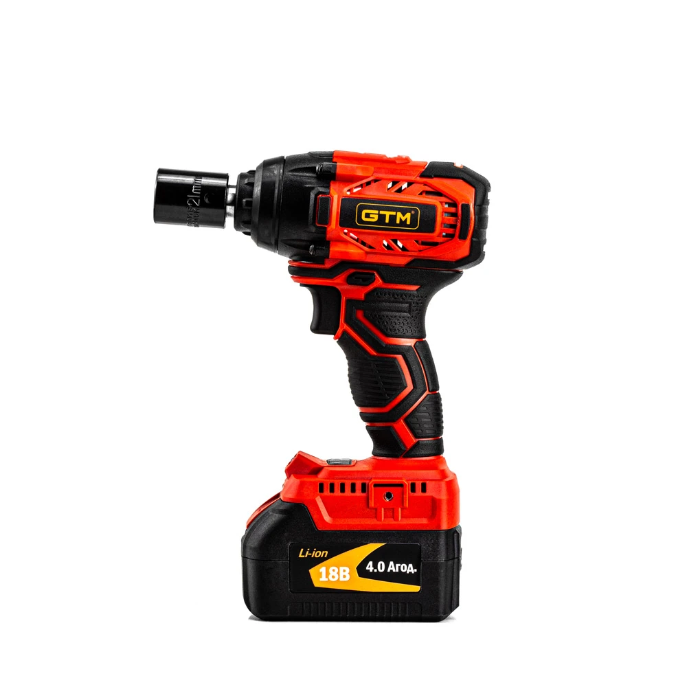 GTM IWC18/320BL - безщітковий гайкокрут професійного класу з живленням від Li-Ion акумуляторів напругою 18 В. Інструмент призначений для роботи з ударними торцевими головками з посадковим квадратом 1/2". Редуктор у даній моделі металевий у повністю металевому корпусі. Максимальний крутний момент затягування в гайкокруті становить 320 Н*м. Також є перемикач імпульсного режиму, для більш акуратної роботи з болтами.
