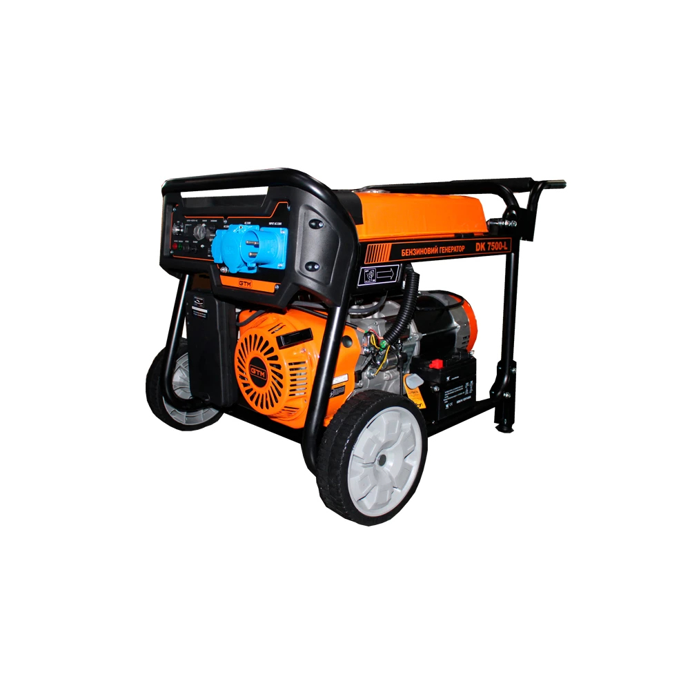 GTM DK7500-L – бензиновий електрогенератор для забезпечення живлення обладнання у разі відсутності електроенергії. Оснащений 4-х тактним двигуном DK192F, який відрізняється економічністю, низьким рівнем викидів та шуму. Максимальна потужність на виході генератора становить 7,5 кВт. Ідеальний варіант для використання у побутових умовах, на дачі або у невеликих магазинах. Під час роботи повного бака палива об'ємом 25 л вистачить до 7 годин при 100% навантаженні. Вбудований АВР дозволяє налаштувати автоматичне увімкнення генератора при відключенні мережі.