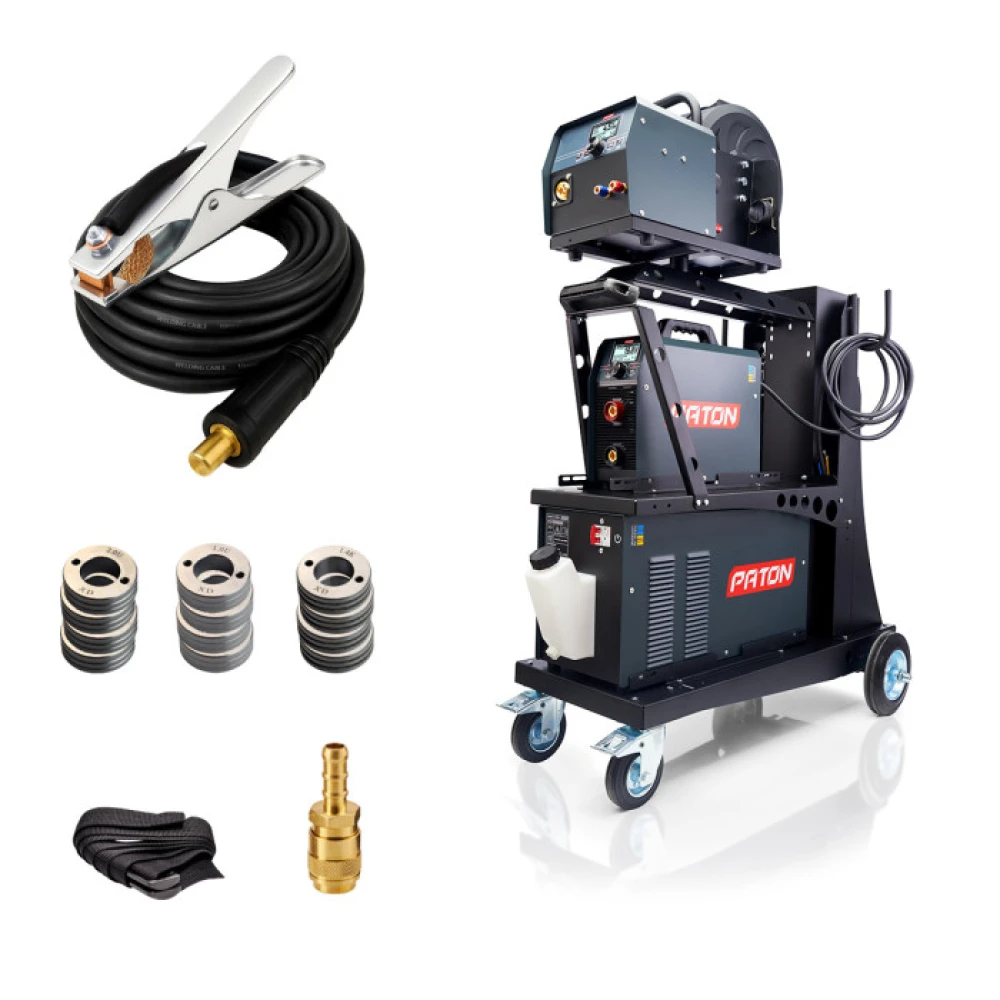 PATON ProMIG-350-15-4 WK обладнаний якісним металевим 4-х роликовим механізмом подачі дроту з потужним герметичним двигуном, а універсальний роз'єм KZ-2 типу «ЄВРО» дозволяє підключати зварювальні пальники від широкого ряду виробників. Також оснащений 4-ма роз'ємами для підключення шланга рідинного охолодження і кабелю з силовими контактами. Потужний кронштейн під зварювальний дріт дозволяє встановлювати котушки вагою до 15 кг. Модель ProMIG-350-15-4 в поєднанні з високою потужністю і продуктивністю, має невелику вагу і габаритні розміри. А завдяки РК-екранам апарат легко і зручно налаштувати під вирішення будь-якого завдання. Апарат комплектується якісними аксесуарами від компанії ABICOR BINZEL, які дозволяють відразу почати працювати в режимах MIG/MAG і MMA.
