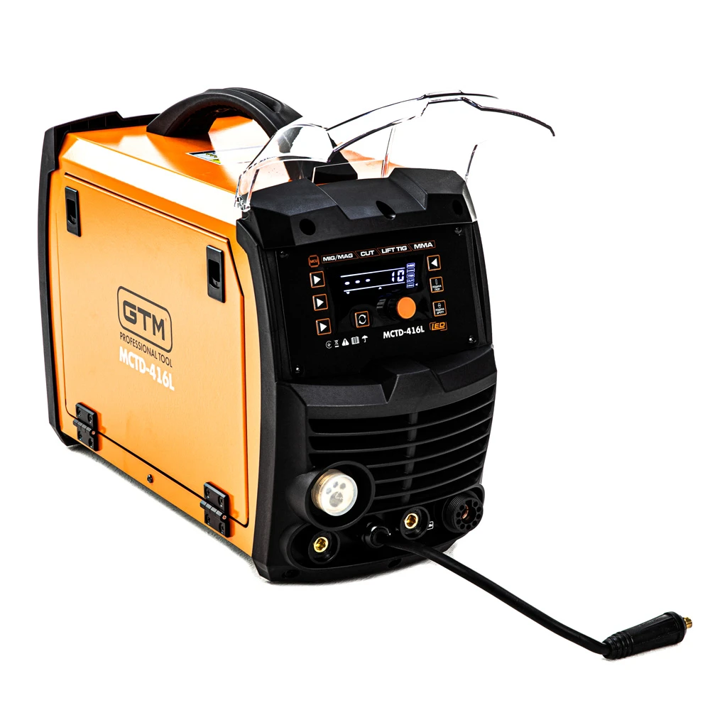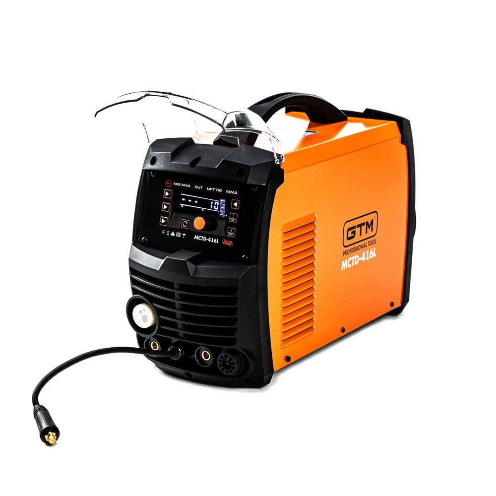 GTM MCTD-416L - багатофункціональна установка для зварювання чорних металів у середовищі захисних газів. Відмінною особливістю цієї моделі є універсальність: крім основного режиму MIG, є режим ручного ММА і аргонодугового зварювання LIFT TIG, а також режим плазмового різання CUT. Напівавтомат обладнаний великим LCD-дисплеєм, на якому відображаються поточні налаштування і параметри.