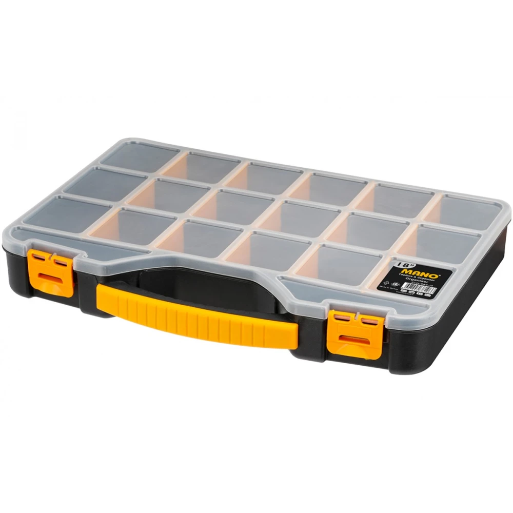MANO ORG-18 - компактний органайзер для зберігання витратних матеріалів у гаражі, вдома, майстерні або на дачі. Дана модель має 18 контейнерів, придатних для для шурупів, цвяхів та інших витратних матеріалів.