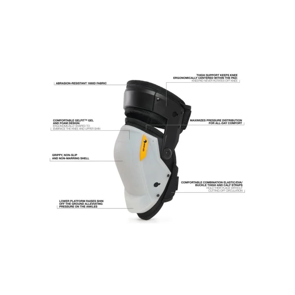 Пара інноваційних професійних робочих наколінників Type Grip TB-KP-G3R зі стабілізацією підтримки стегна з лінії GelFit™ вищого класу, розробленої командою спеціалістів TOUGHBUILT® у США, із зовнішньою оболонкою для чутливих статей. Наколінники TOUGHBUILT® є еталоном у світі робочих наколінників для професіоналів і водночас є гарантією найвищої якості. На них поширюється обмежена гарантія терміном до 25 років для початкового покупця. Стабілізувальна опора для стегон - це новий стандарт ергономіки для повсякденного використання при збереженні максимального комфорту і зручності при стоянні на колінах. Він забезпечує ідеальну стійкість і водночас забезпечує легке переміщення з боку в бік. Опора для стегон завжди утримує коліно ергономічно по центру наколінника. Ці подушечки ніколи не відхиляються від коліна і завжди міцно залишаються на місці. Надміцна двокомпонентна зовнішня оболонка, що не б'ється, з поверхнею, що не ушкоджує чутливі підлоги, захищає коліна навіть на найбільш пересіченій місцевості, забезпечуючи при цьому легкий рух з боку в бік. Балістичний нейлон 1690D завершує міцну конструкцію. Ергономічний дизайн гелю і піни GelFit™ повторює природну форму коліна і верхньої частини гомілки і максимально розподіляє тиск, забезпечуючи комфорт протягом усього дня. Піднесена нижня платформа на зовнішній оболонці з поверхнею, що не пошкоджує чутливі підлоги, допомагає утримувати гомілку вище за землю, зменшуючи тиск на щиколотки. Високі бічні стінки значно посилюють стійкість на колінах і запобігають повороту наколінників у неприродне положення. Гнучкі лямки з сополімеру ЕВА зручно утримують наколінники на ногах з високою стабільністю, завжди на місці без небажаного від'єднання та скочування в бік.