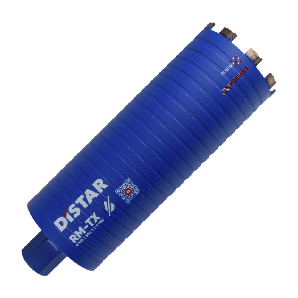 DI-STAR DDS-W 122x300-9x1 1/4 UNC RM-TX - коронка алмазная специально изготовлена для создания отверстий в стенах для прокладки коммуникаций – это главная характеристика алмазных сверл. Особенно это актуально при сверлении стен из высоко армированного прочного бетона в сухом режиме, когда использование охлаждения водой невозможно или не желательно. Коронка — это продукт для высокоскоростного сверления сложных материалов в сухом режиме. В сверлах используются алмазные сегменты с ориентированным алмазом. Турбированная форма сегмента и производительная связка обеспечивают эффективное скоростное сверление. Сверла RM-TX выпускаются наружными диаметрами 42 - 152 мм длиной 300 мм и 450 мм с хвостовиком 1 1/4 UNC. Сверла применяются на ручных сверлильных машинах с микроударом без применения охлаждения.