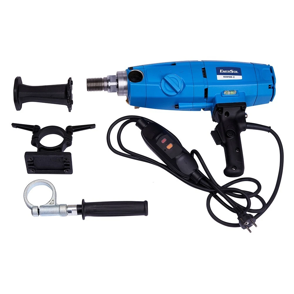 EnerSol ECD-180-2 - электрооборудование для сверления отверстий в бетонных, каменных, кирпичных и гранитных поверхностях при помощи алмазных корончатых сверл. Данная модель может использоваться как на стойке (станине), так и без нее. В случае мокрого сверления, можно подключить внешнюю подачу воды.