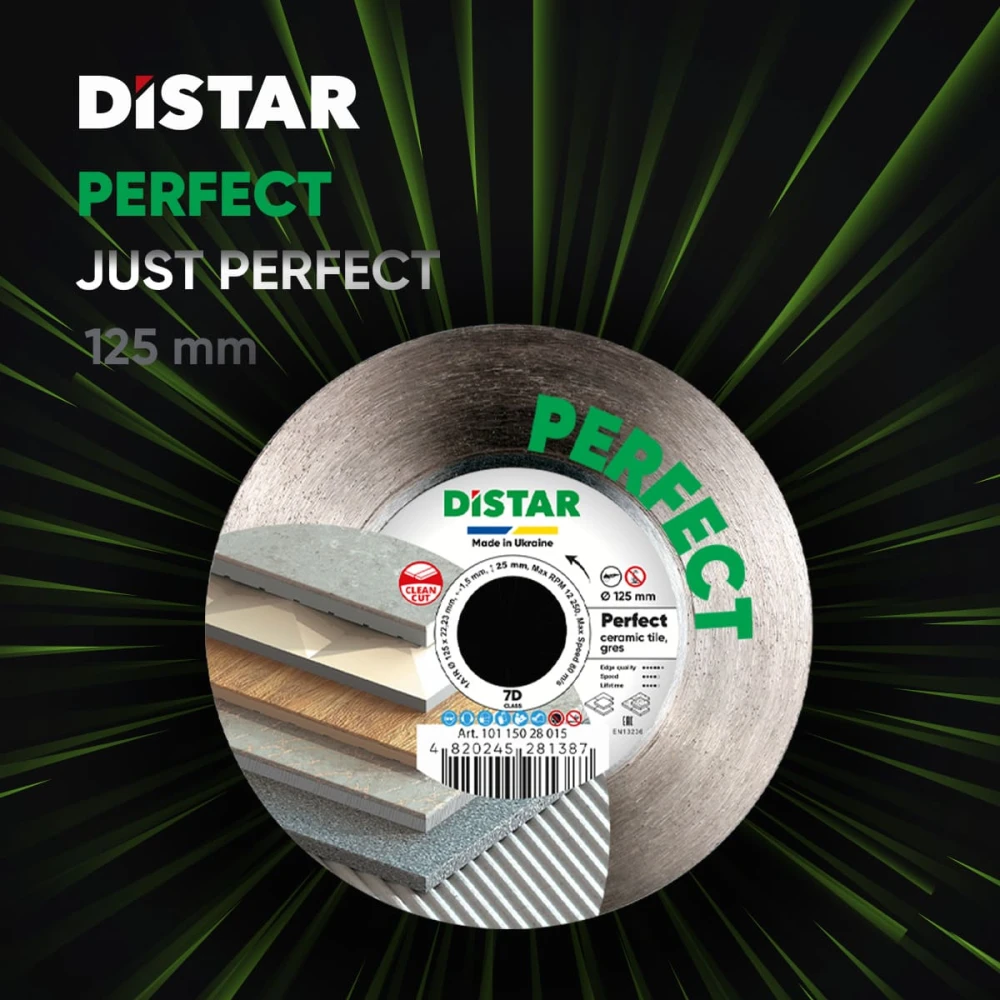 DI-STAR 1A1R 125x22.23х1.5 H Perfect известен многим мастерам, благодаря своему чистому резу. Однако он имеет и недостаток. Чистота реза обеспечивается тонким слоем 1.1 мм, а значит этим диском нужно работать очень аккуратно что бы не вывести его из строя. Диск Perfect это еще более чистый рез и при этом он более прочный и надежный. Надежность обеспечивается увеличенной толщиной слоя 1.5 мм и дополнительным фланцевым корпусом. Чистота достигается уникальной сендвич конструкцией слоя. Теперь можно смело осуществлять резание и наслаждаться суперчистой кромкой. Диск применяется для резания под 90° в сухом режиме на угловой шлифовальной машине. Имеет наружный диаметр 125 мм и посадочное место 22.23 мм.