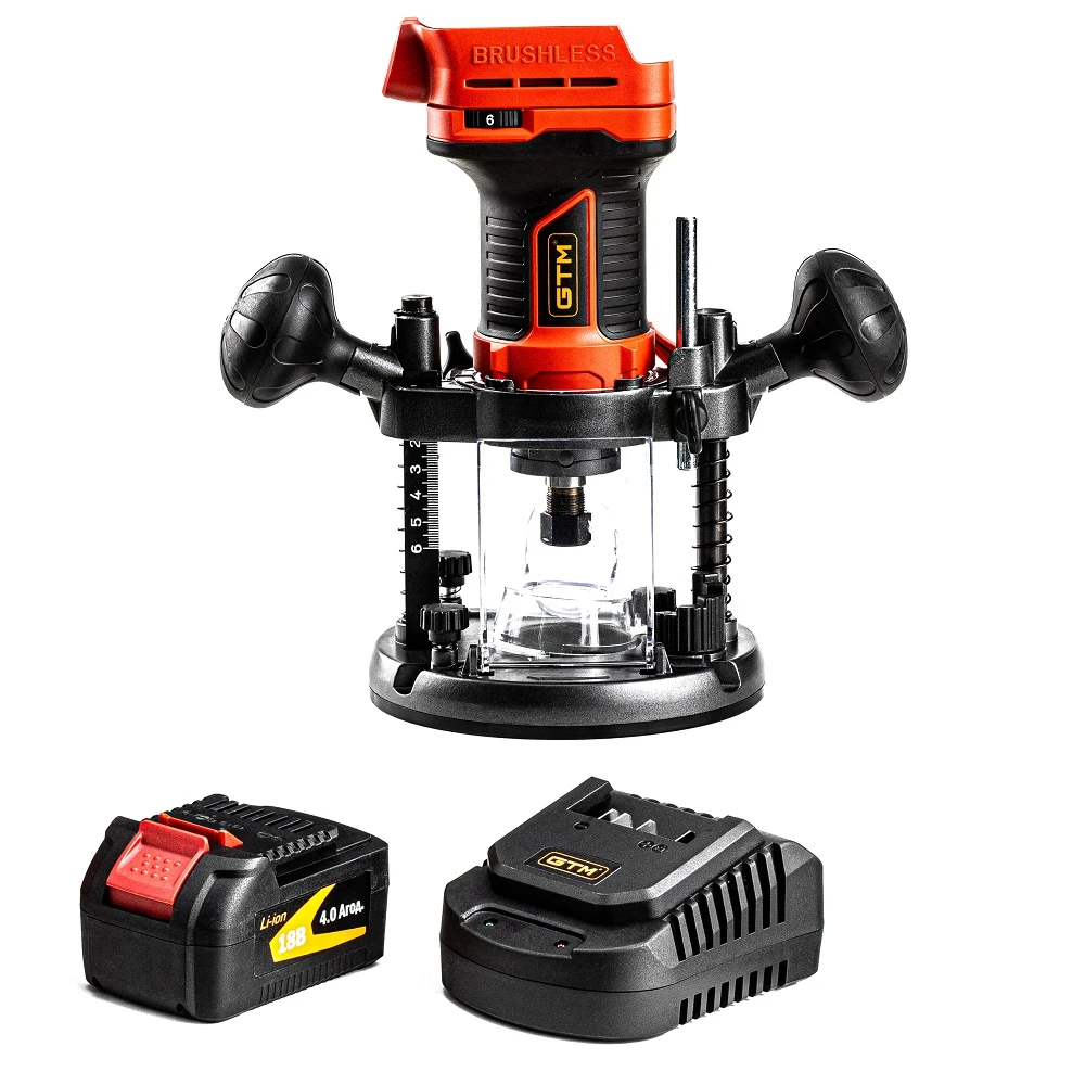 GTM R18/55BL - мощный инструмент при выполнении многочисленных работ по обработке дерева, с питанием от стандартных аккумуляторов GTM 18V. Конструкция данной модели позволяет использовать его как вертикальный, так и кромочный тип фрезера. В фрезер встроен производительный бесщеточный двигатель, который намного эффективнее расходует заряд аккумулятора. Регулируемая цанга дает возможность применять фрезы с хвостовиком 6 мм и 8 мм.