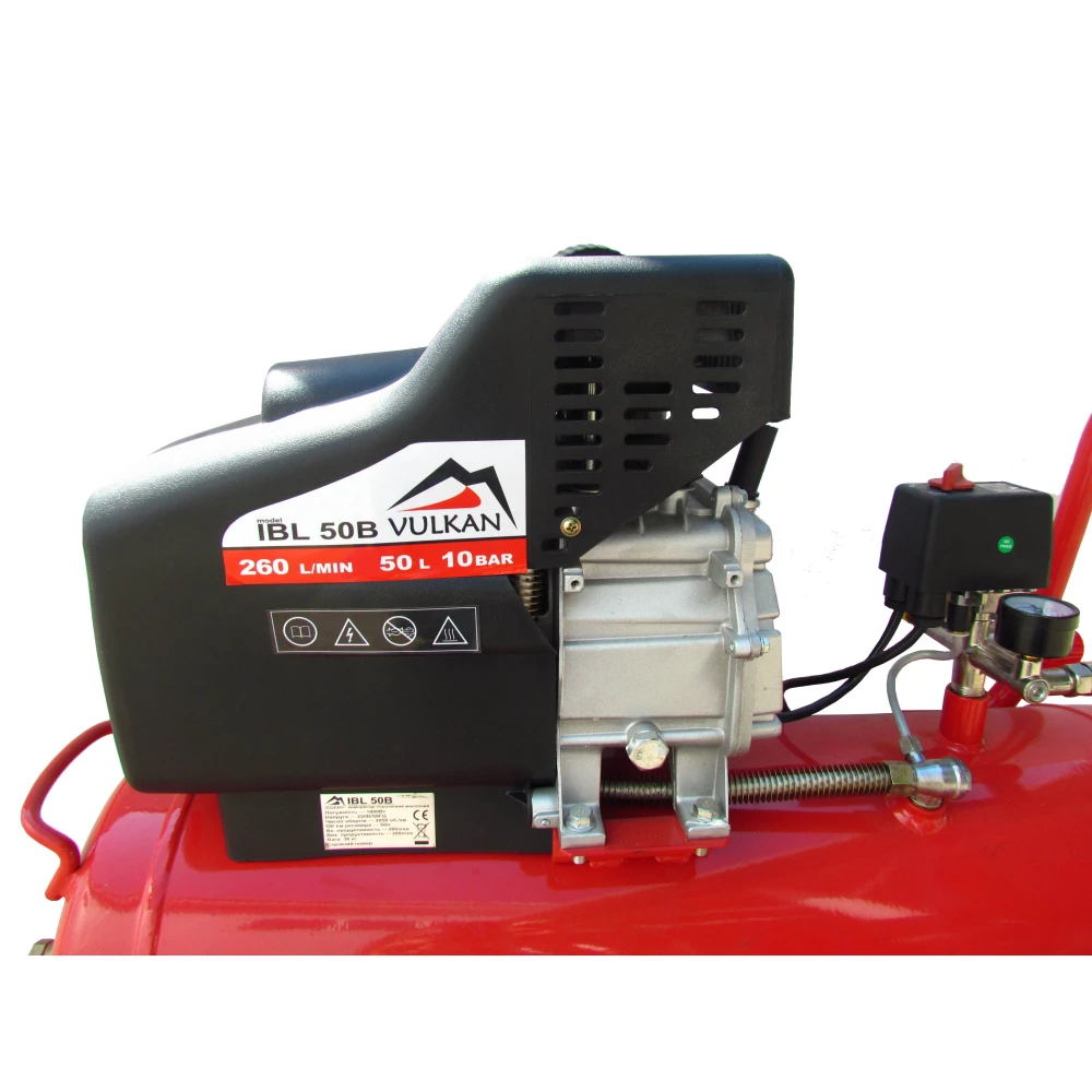 Воздушный компрессор Vulkan IBL 50B - оборудование для сжатия воздуха и дальнейшей его подачи под давлением в пневматическое оборудование или инструменты. Данная модель оснащена надежным блоком автоматики KONDOR.