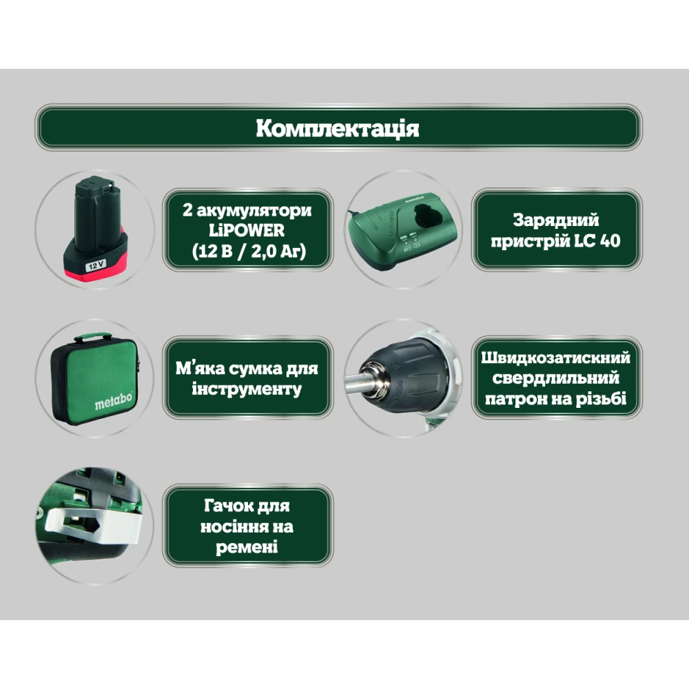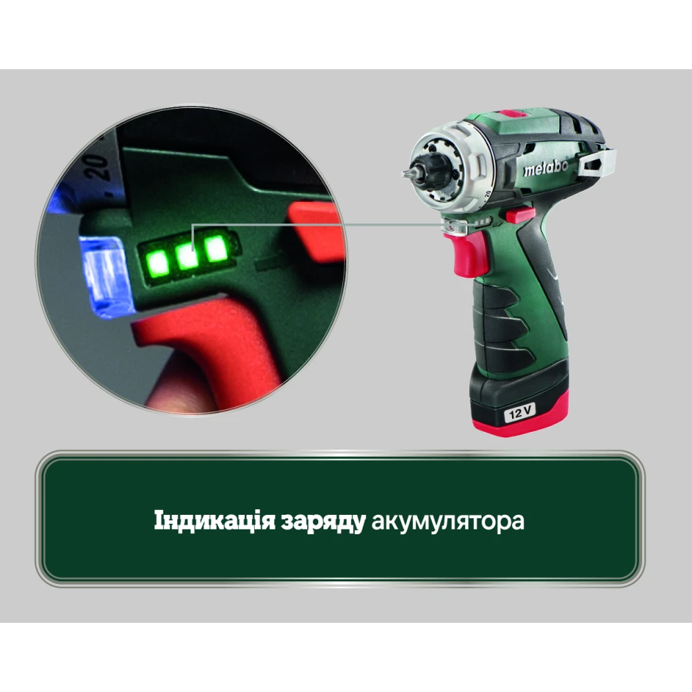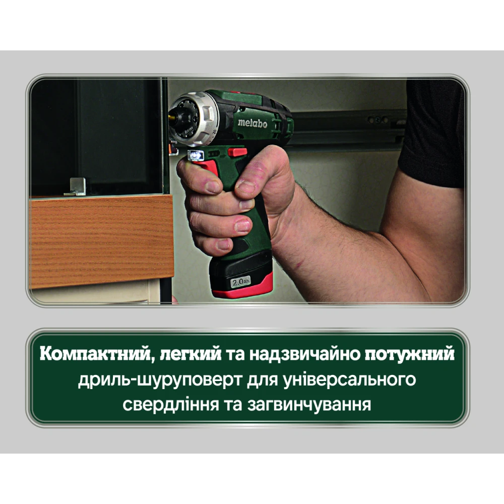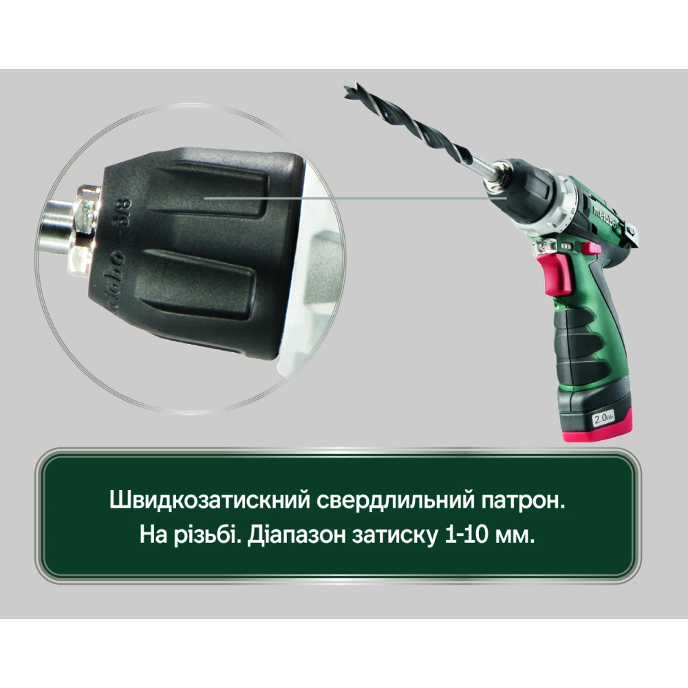 Metabo PowerMaxx BS Basic - компактная дрель-шуруповерт повышенной мощности, которая предназначается для бытового использования. Питается от Li-Ion аккумуляторов Metabo с напряжением 12 В. В шуруповерт встроен двухскоростной редуктор с металлическими шестернями, что значительно увеличивает срок службы инструмента. На первой скорости 360 об/мин шуруповерт развивает крутящий момент до 34 Нм, что позволяет закручивать крепежи. На второй скорости 1400 об/мин пользователь может эффективно сверлить различные материалы: дерево, металл и тд. Встроенная защитная электроника предохраняет аккумулятор от перегрузки, перегрева и глубокой разрядки. Шуруповерт комплектуется 10 мм быстрозажимным патроном с автоматической блокировкой шпинделя. Шуруповерт Metabo PowerMaxx BS Basic поставляется в сумке с 2 аккумуляторами ёмкостью 2 А*ч и зарядным устройством.