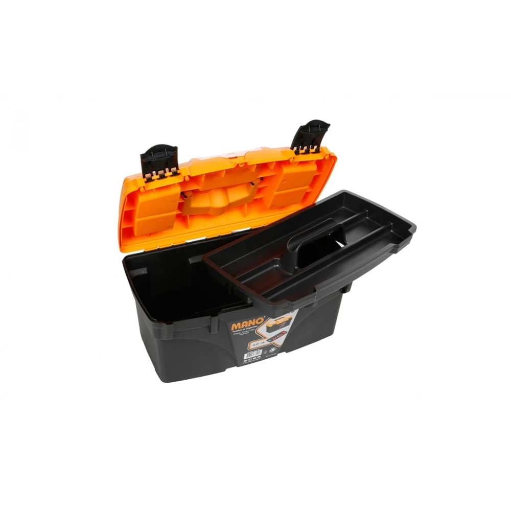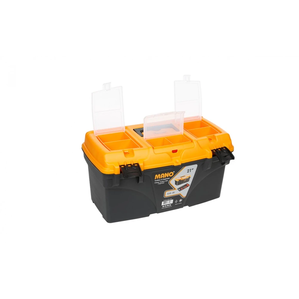 MANO C.O-21- компактный пластиковый контейнер для удобного хранения ручных инструментов в автомобиле, гараже, дома, мастерской или на даче. Данная модель имеет прочную пластиковую ручку, органайзер на крышке и дополнительный съемный лоток для расходных материалов внутри. Ящик в основном предназначенный для любительского использования, но оснащен всем нужным для профессионалов.