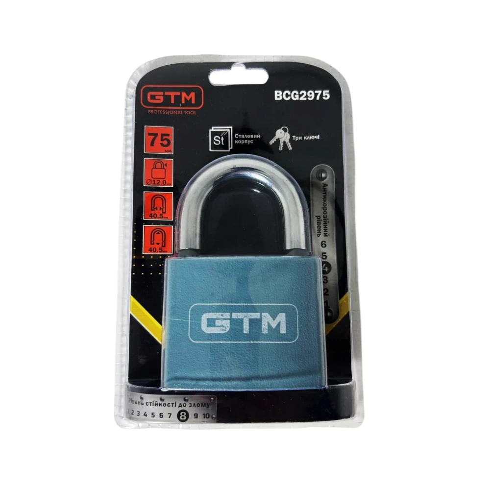 Навесной замок GTM BCG2975 имеет стандартный размер 75 мм.
