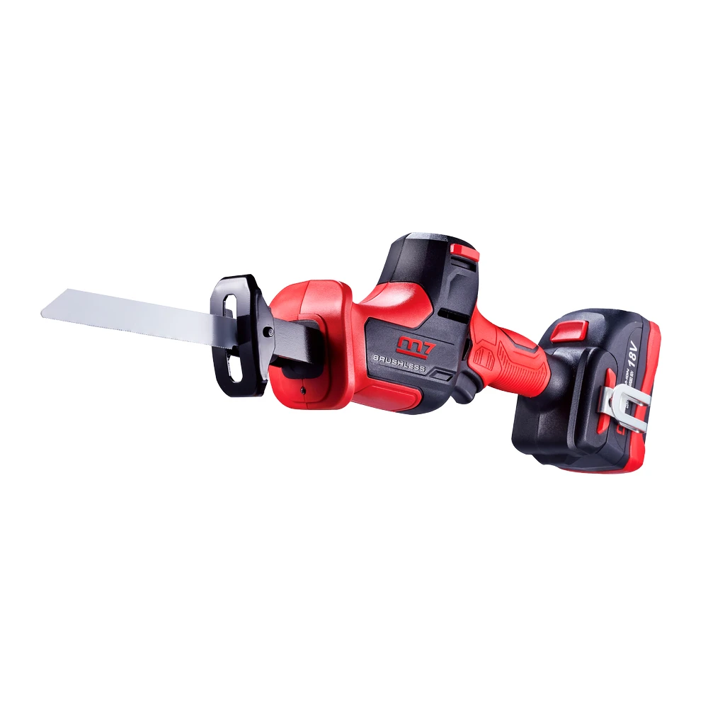 Mighty Seven DRS-102A - професійний інструмент для розпилу широкого спектра матеріалів: від дерева і листів фанери до кольорових металів або сталі. Шабельна пила живиться від стандартних акумуляторів M7 18V. Вбудований безщітковий двигун дає змогу працювати довше від акумулятора. Швидкість ходу пилочки регулюється простим натисканням на курок під час роботи. Додатково в інструмент вбудована система швидкої заміни пильних полотен без ключа.