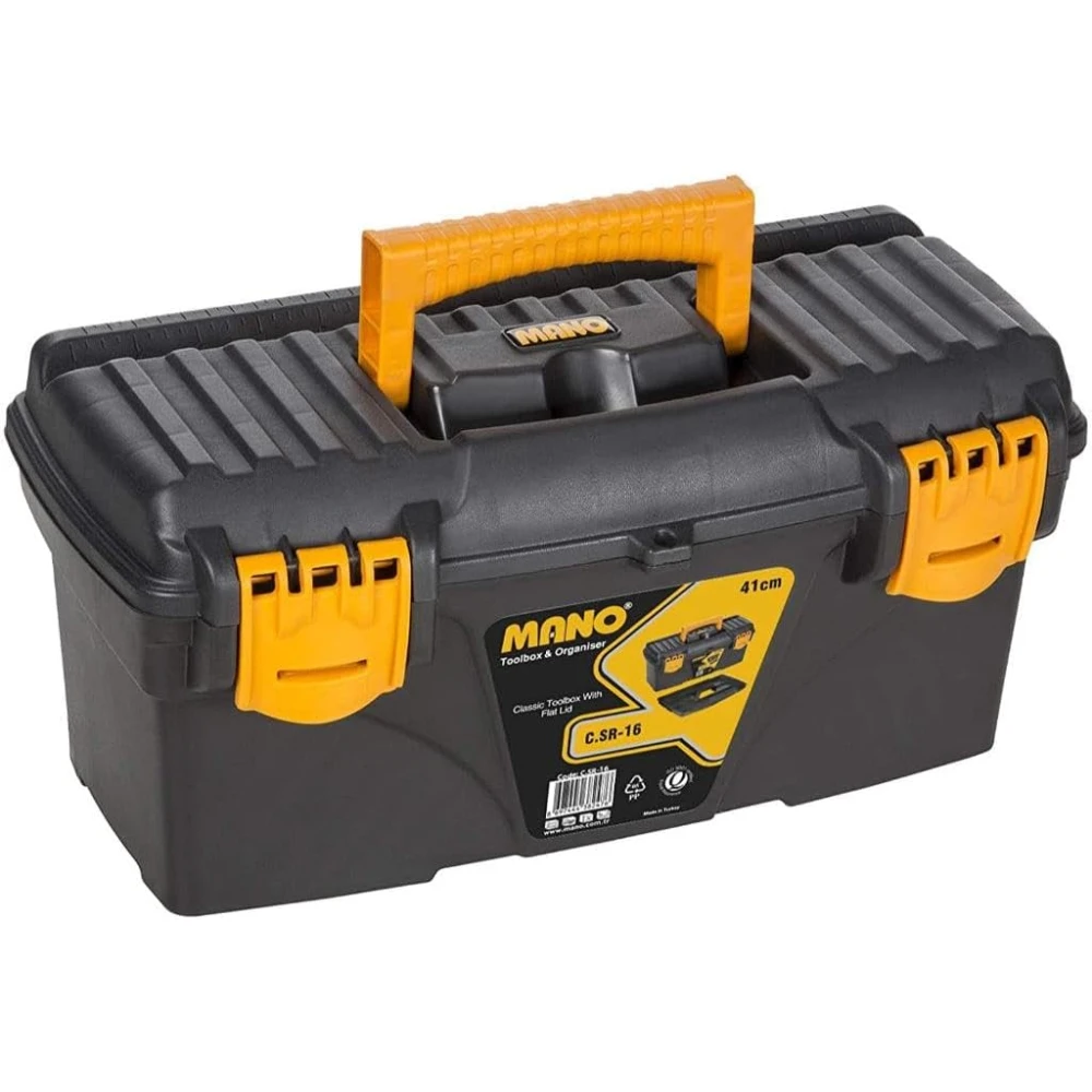 Ящик для інструментів MANO C.SR-16 (16 дюймів) є ідеальним вибором для зберігання та організації ручного інструменту. Компактний і легкий, вагою всього 1,2 кг, пластиковий ящик розміром 410×209×195 мм оснащений п'ятьма відділеннями та знімним лотком для дрібних деталей, що дозволяє швидко знаходити інструменти. Кришка з органайзером відсутня, але зручна складна ручка забезпечує легке транспортування, а пластикові замки надійно фіксують вміст. Виготовлений у Туреччині з міцного пластику, цей дешевий кейс для інструментів практичний і довговічний, ідеально підходить для домашніх майстрів, професійної роботи на виїзді та зберігання дрібних деталей. Практичний, легкий і надійний, MANO C.SR-16 стане незамінним помічником при будь-якому ремонті або будівництві.
