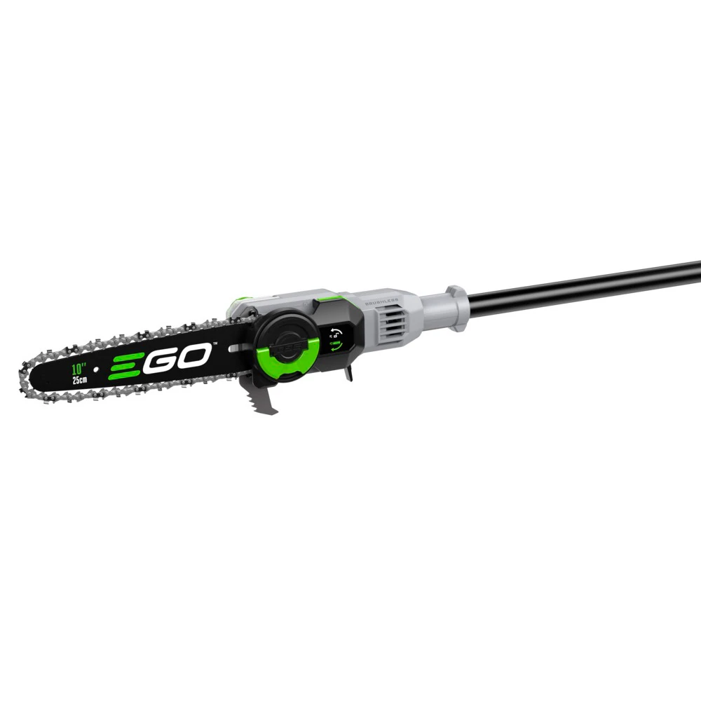 EGO PS1003E KIT - акумуляторний висоторіз професійного класу, що використовується для обрізки крони дерев і кущів. Призначений для використання комунальними господарствами, садівниками та ландшафтними дизайнерами. Інструмент обладнаний безщітковим двигуном постійного струму і телескопічною штангою з вуглеволокна для максимального полегшення ваги. Висоторіз живиться від універсальних акумуляторів EGO Power+ з напругою 56 В.