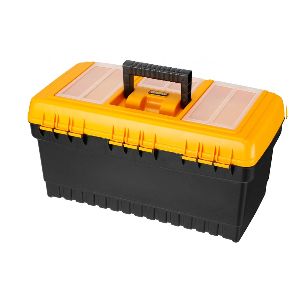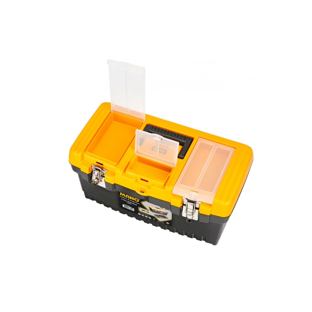 MANO MT-19 - компактний пластиковий контейнер для зручного зберігання ручних інструментів в автомобілі, гаражі, вдома, майстерні або на дачі. Ця модель має міцну пластикову ручку, органайзер на кришці і додатковий знімний лоток для витратних матеріалів всередині. Ящик здебільшого призначений для аматорського використання, але оснащений усім необхідним для професіоналів.