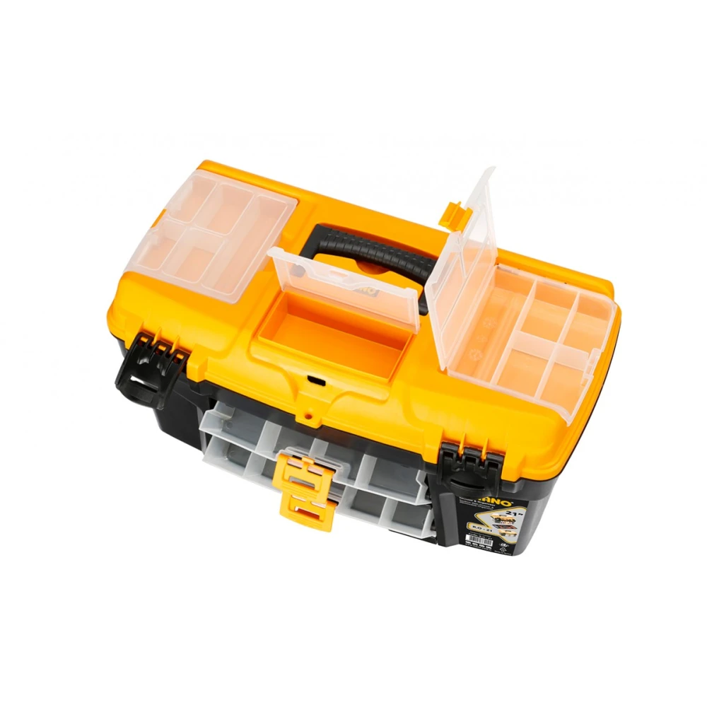 MANO R.O-21 - компактний пластиковий контейнер для зручного зберігання ручних інструментів в автомобілі, гаражі, вдома, майстерні або на дачі. Ця модель має міцну пластикову ручку, органайзер на кришці і 2 додаткові висувні шухляди для витратних матеріалів всередині. Ящик здебільшого призначений для аматорського використання, але оснащений усім необхідним для професіоналів.