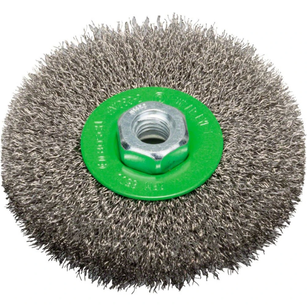 • Кільцева щітка з нержавіючого дроту, оптимально підходить для зняття побіжалості в зварних швах на високоякісній сталі, для видалення іржі, надання шорсткості, матування, зняття лакофарбових покриттів, структурування.